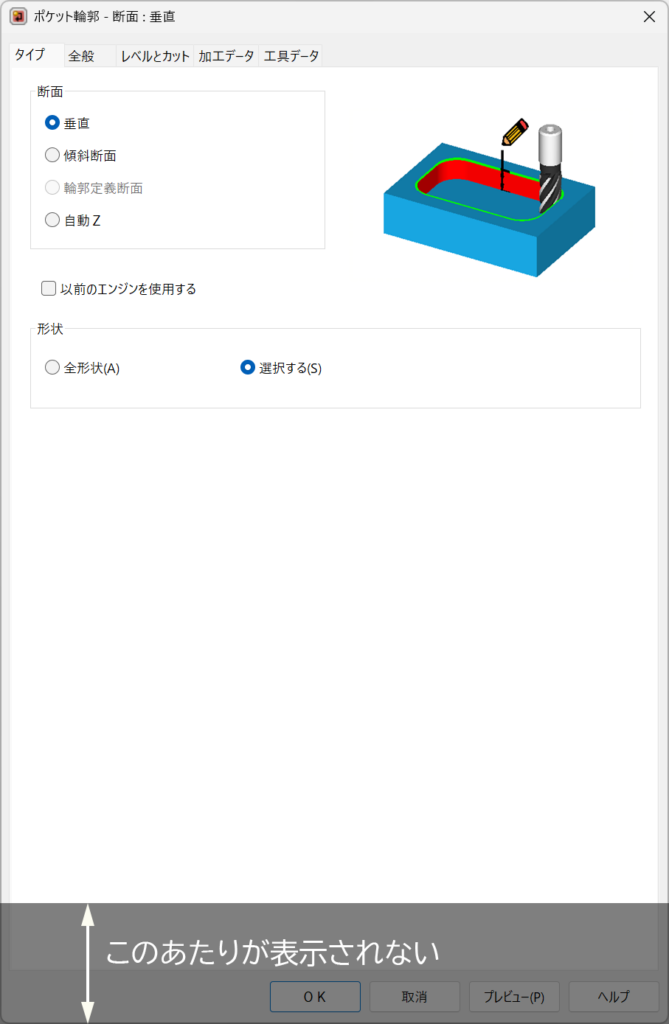 ポケット加工等のダイアログ画面がスクリーンサイズを超えてしまい、表示されなくなる場合があります。